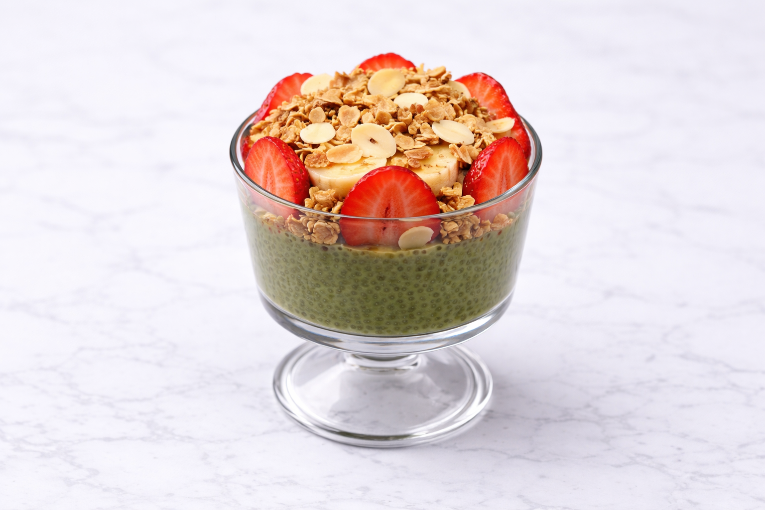 prepared overnight with oat milk and matcha served with banana, strawberry, sliced almond & granola